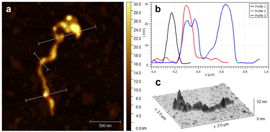 Physicochemical analysis of MWCNT/LS/NPd. (a) AFM image with corresponding cross-section locations, (b) AFM cross-section of MWCNT/LS/NPd, and (c) 3D visualization of MWCNT/LS/NPd.