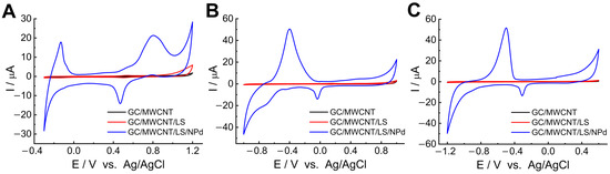 The electrochemical study of the MWCNT/LS/NPd material was performed at the GC electrode using the CV technique. To best investigate the electrochemical performance of the modified electrode, measurements were carried out in three different electrolytes with various pH: 0.1 M HClO4 (pH = 1.1), 0.05 M PB buffer (pH = 7.4), and 0.1 M NaOH (pH = 13.0). The recorded voltammograms are shown in Figure 5. Analysis of the CV responses reveals typical signatures for palladium-based electrodes, including characteristic peaks for hydrogen adsorption/desorption [79,80,81,82,83,84,85]. Specific palladium redox processes also occurred, which were particularly evident in 0.1 M HClO4 (Figure 5A), presumably due to the higher concentration of H+ ions in the electrolyte. A broad wave of palladium oxide film formation was recorded from 0.7 V to 1.0 V, followed by a peak of reverse cathodic reduction of palladium oxides at E0′ = 0.45 V.