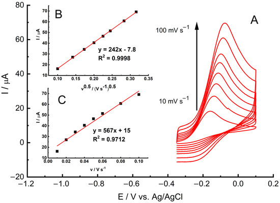A study on scan rates was conducted using the GC/MWCNT/LS/NPd electrode in a PB buffer (0.05 M) with a 10 mM hydrazine solution within the range of 10 to 100 mV s−1. As illustrated in Figure 8, the oxidation peak current exhibited an increase with higher scan rates. Remarkably improved linearity (R2 = 0.9998) was achieved when plotting the catalytic current against the square root of the scan rate, denoted as I vs. ν1/2 (Figure 8B), in contrast to the relationship between I and v (R2 = 0.9712) (Figure 8C). This electrode response strongly indicates that the process is limited by diffusion. It is worth noting that this diffusion-controlled response is the preferred behaviour for the accurate application of the modified electrode in quantitative analysis.