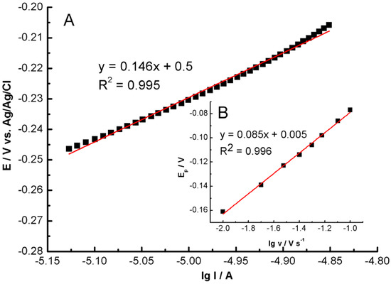 (A) The relationship of E vs. lg I (Tafel plot) recorded at 1 mV s−1 in the presence of 10 mM hydrazine. (B) Plot of oxidation peak potential versus logarithm of scan rate. Data collected from Figure 8A.