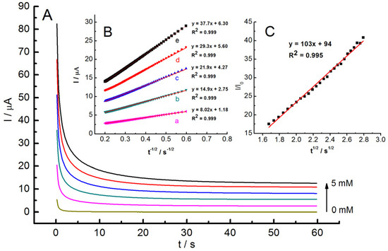where I0 and Icat are the currents recorded in the absence and in the presence of hydrazine, respectively, kcat (M−1 s−1) is the second-order catalytic rate constant, c0 (M) is the concentration of hydrazine, and t (s) is time elapsed. The plot of I/I0 vs. t1/2 for 5 mM of hydrazine was linear (Figure 10C). From this slope, the kcat was estimated to be 6.76 × 105 M−1 s−1.