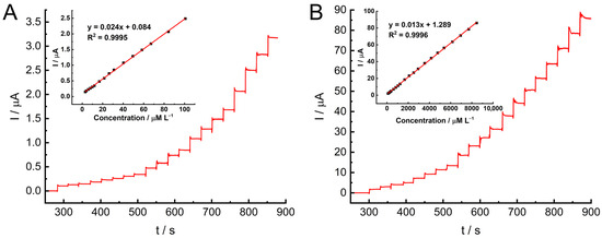 The chronoamperometric test was then performed at the GC electrode under optimized conditions in PB buffer at a constant stirring rate of 1000 rpm (Figure 11). To ensure the precise determination of hydrazine during its electro-oxidization process, measurements were recorded at 0.0 V. For the experiments, two hydrazine injection ranges were used, i.e., 1–100 µM (Figure 11A) and 100–10,000 µM (Figure 11B). Four injections were consecutively applied at each concentration. In both ranges, the recorded response changed at different hydrazine concentrations and was almost linearly proportional to the hydrazine concentration in the electrolyte across the entire region. For concentrations ranging from 3.00 to 100 µM L−1, the linear regression equation was determined as I (μA) = (0.024 ± 0.0001) C + (0.084 ± 0.0067), with an R2 value of 0.9995. The limit of detection (LOD) was calculated to be 0.80 µM L−1 using the formula LOD = (K × SDa)/b, where K = 3.3 and b is the slope. The limit of quantification (LOQ) was found to be 2.42 µM L−1 based on the equation LOQ = 3 × LOD. For the second linear range, 100–10,000 µM L−1, the equation was I (μA) = (0.013 ± 0.00004) C + (1.289 ± 0.18057), with R2 = 0.9996.