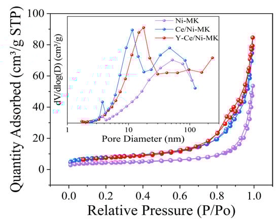 Corresponding BJH pore size distributions and N2 adsorption–desorption isotherms for Ni-MK, Ce/Ni-MK, and Y-Ce/Ni-MK catalysts.