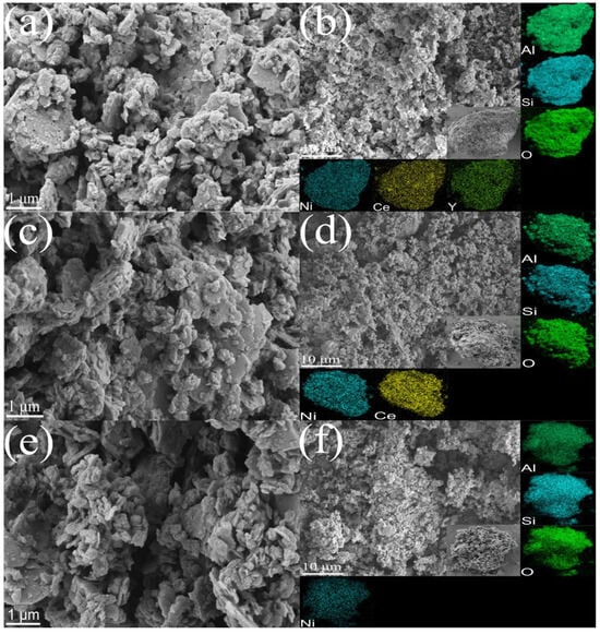 The pore structures of the Y-Ce/Ni-MK, Ce/Ni-MK, and Ni-MK samples after reduction are clearly visible in Figure 2. After incorporating active metals and promoters onto MK, the catalyst surfaces manifest a stratified morphology, which is advantageous in augmenting the specific surface area available for reactions. Furthermore, in contrast to nickel-containing catalysts documented in Table 2, the presence of smaller nickel nanoparticles in the catalysts investigated in this study suggests that MK offers a distinct advantage as a support for nickel-based catalysts compared to pure oxides. According to the EDS images, Y2O3, CeO2, and nickel nanoparticles are evenly dispersed on the MK substrate, with the nickel nanoparticles demonstrating excellent dispersion on the Y-Ce/Ni-MK catalyst. Combining Figure 2f with the EDS image of the Ni-MK catalyst reveals that the porosity within the Ni-MK catalyst is blocked, and the exterior is coated with unevenly dispersed metallic nickel.