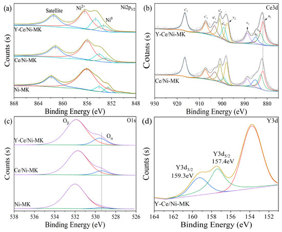 To assess the surface composition of the catalyst and the metal oxidation states, XPS examination was conducted on the catalyst after reduction. Illustrated in Figure 5a, the XPS graph of Ni2p3/2 obtained from the Y-Ce/Ni-MK catalyst exhibits Gaussian peaks positioned at 853.3, 854.5, and 856.2 eV, signifying the presence of Ni0, NiO, and Ni(OH)2, in that order. The 861.5 eV peak corresponds to the shake-up satellite feature [41,42]. The occurrence of Ni2+ can be linked to the incomplete oxidation of the catalyst while being exposed to air throughout the transfer process after reduction in a tubular furnace. Both Ce/Ni-MK and Ni-MK exhibit similar four peaks, but the binding energy of Y-Ce/Ni-MK is higher compared to the other two. Additionally, based on quantitative atomic energy ratio analysis (as shown in Table 3), the addition of Y2O3 increases the ratio of Ni0/(Ni0+Ni2+) from 5.5% to 10.2% for the Y-Ce/Ni-MK catalyst. The incorporation of Y results in an increased extent of Ni0 reduction, enhancing the abundance of active sites and subsequently improving the catalytic activity.