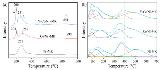 H2-TPR experiments were conducted on the three catalysts across a temperature span from 50 to 1000 °C to investigate the interaction between Y2O3 and NiO, CeO2, as well as the catalysts’ reducing abilities. The H2-TPR curves are shown in Figure 6, while Table 4 presents the peak temperatures and values for hydrogen consumption. In the graph, the Y-Ce/Ni-MK catalyst showed three reduction peaks, designated as α, β, and γ. The relatively weak γ peak appearing at (T > 800 °C) indicates the reduction of surface-bound lattice oxygen in CeO2 [44]. The limited interaction between NiO and the MK carrier, as indicated by its larger particle size, can be attributed to the presence of the β peak, which corresponds to the reduction of NiO [33]. The infiltration of Y3+ or Ni2+ within the CeO2 matrix, leading to the formation of Y-Ce-O or Ni-Ce-O homogeneous phases, surplus oxygen vacancies are generated. Consequently, the appearance of the α peak can be ascribed to the reduction of oxide entities attached to these vacancies [40]. With the addition of Y, the intensities of α and β peaks increase and shift towards lower temperatures. Research findings indicate a correlation between the reduction temperature and the dimensions of NiO particles, wherein smaller particle sizes correspond to reduced temperatures for the reduction process [45]. Within the context of this experiment, the introduction of Y element demonstrates a decrease in the temperature at which the main peaks undergo reduction, an augmentation in the catalyst’s capability to store hydrogen, a decrease in the dimensions of NiO particles, and a reinforcement in the interplay between multimetallic species and the carrier. It is noteworthy to highlight that the hydrogen utilization associated with the α peak (as shown in Table 4) exhibits an upward trend upon the introduction of Y. Meanwhile, the hydrogen consumption corresponding to the β peak also shows a corresponding increase as a result of the heightened existence of oxygen vacancies. Nevertheless, the utilization of hydrogen for the β + γ peaks experiences an increase in the Y-Ce/Ni-MK catalyst. This suggests that Y-Ce/Ni-MK catalyst produces more oxygen vacancies in CeO2, exhibiting stronger oxygen chemisorption capacity.
