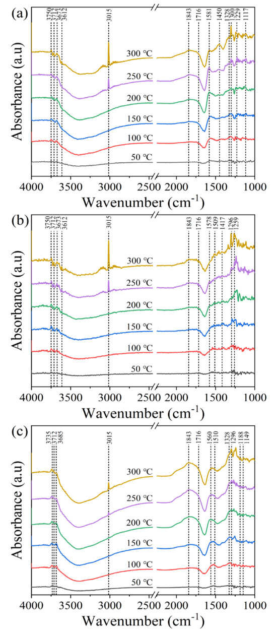In situ DRIFTS investigation of CO2 methanation over the all catalysts: (a) Y-Ce/Ni-MK, (b) Ce/Ni-MK, and (c) Ni-MK catalysts.