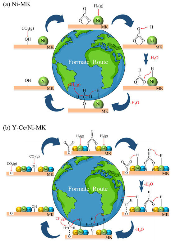 The main proposed pathway for CO2 methanation over (a) Ni-MK and (b) Y-Ce/Ni-MK catalysts.
