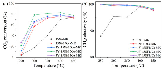 The Y-Ce/Ni-MK, Ce/Ni-MK, and Ni-MK catalysts synthesized in this study exhibited (a) CO2 conversion and (b) CH4 selectivity.