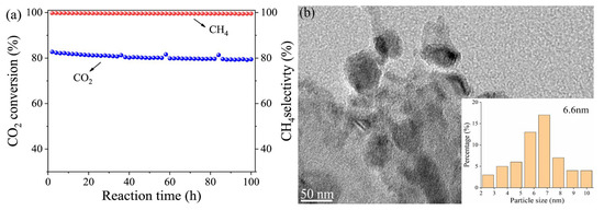 The stability over extended periods is essential for the successful commercialization of any catalyst. Therefore, stability tests were performed on the catalyst samples of Y-Ce/Ni-MK that exhibited optimal performance. The catalyst underwent a stability test for a duration of 100 h, employing the following reaction conditions: the pressure set at 0.1 MP, the temperature maintained at 400 °C, and a flow rate of 12,000 mL·h−1·g−1. The catalyst’s CH4 selectivity and CO2 conversion rate are depicted within Figure 10a. Throughout the 100 h test, the catalyst exhibited a decrease in its CO2 conversion efficiency of approximately 3.9%, while the CH4 selectivity exhibited no changes. Figure 10b displays the TEM image depicting the Y-Ce/Ni-MK catalyst following the 100 h stability test. Only a minor aggregation of nickel particles was observed, resulting in a rise in the mean diameter of Ni particles from 5.4 nm to 6.6 nm. In summary, the MK-based catalyst exhibits excellent stability during long-term catalysis, and the addition of Y-Ce initiators synergistically enhances the low-temperature activation performance of the MK support, while simultaneously improving the catalyst’s stability over an extended duration.