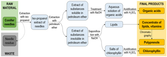 The biorefinery of lipophilic extracts from coniferous greenery follows a conceptual process that includes several steps: (1) extraction with hydrocarbons; (2) separation of obtained extracts from needle mass; (3) isolation of needle waxes; (4) distillation with water vapour or solvent distillation to obtain essential oils; (5) extraction with subsequent saponification to produce so-called chlorophyll-carotene paste; (6) treatment of the extract from step 2 with a solution of alkalis (NaOH) to transfer organic acids in sodium form (solubilize) with following acidification and splitting into two fractions (balm paste and sodium chlorophyllin); and (7) re-extraction of the solution after step 2 with petrol to obtain a complex of provitamins. This detailed biorefinery strategy allows for the production of six products: essential oils, chlorophyll-carotene paste, balm paste, sodium chlorophyllin, and a complex of polyvitamins (Figure 3). This strategy was developed and implemented in the Soviet Union and products nowadays are produced in Russia and partly in Latvia, but it is not widely known in other countries.