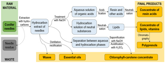 From an application perspective, lipids constitute a significant group of components found in coniferous needles/greenery. To extract this group of substances from needles, the use of low-polarity solvents becomes necessary. Considering the substantial volumes of needles to be processed, hydrocarbons are preferred as extractants. Various solvents, including linear alkanes (hexane, octane), cycloalkanes (cyclohexane), chlorinated solvents and similar compounds have been studied for their ability to extract lipids and other low-polarity components from coniferous needle/greenery biomass. The yields of extractives using low-polarity solvents are generally significantly lower compared to the use of alcohols, alcohol/water mixtures, or water as extractants. Typically, the yield is <10% of the dry mass. When using low-polarity solvents, low-polarity substances like alkanes, fatty acids and their esters, diterpenes, sesquiterpenes, esters of resin acids, polyprenols, and others are transferred to the liquid phase. Furthermore, due to the co-extraction of multiple substance groups when using hydrocarbons, advanced biorefinery methods have been proposed and described in various studies [123,124,125] (see Figure 3).