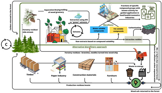 The forestry sector plays a significant role in the economies and ecologies of many countries [16]. As illustrated in the preceding discussion’s part, the residues and by-products of coniferous needles are rich in a wide range of industrially relevant compounds, highlighting their potential as valuable resources within the circular bioeconomy. Given the high chemical diversity of coniferous needles/greenery, their potential for use in the circular bioeconomy is significant. However, to fully exploit this potential, further development of biorefinery approaches is necessary to effectively valorize the side streams of forestry biomass.