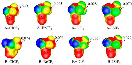 Figure 1 shows the electrostatic potential diagrams for the monomers of the electron acceptors A–XTF3 and B–XTF3. The red positive electrostatic potential region on the extension line of each molecule’s X–T bond is the σ–hole. The figure also shows the positive electrostatic potential values Vs, max on the 0.001 a.u. isosurface. It can be seen from the figure that the Vs, max of B–XTF3 is greater than that of A–XTF3, contrary to the fact that F is more electronegative than Cl (more on this later); however, Vs, max decreases in the order X = Cl > Br > I, consistent with the electronegativity of the halogen atom X. The electrostatic potential for the SiF3-containing monomer is more than twice the value for its CF3-containing analogue.