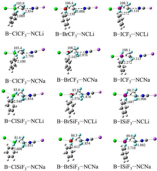 Previous studies found that the TB formed by the –CF3 group is weak, and even when the electron donor atom is connected to hydrogen atoms, it is more inclined to form hydrogen bonds. When anions act as electron donors in these types of complexes, their interaction energy rarely exceeds 7 kcal/mol [50]. However, when the –CF3 group is connected to a hypervalent halogen group, it not only forms a TB but also gives rise to relatively large interaction energies in many cases, such as in B–ClCF3⋯NCNa, where the interaction energy exceeds 11 kcal/mol. Therefore, we have found an effective way in the present work to promote strong TB formation with the –CF3 group.