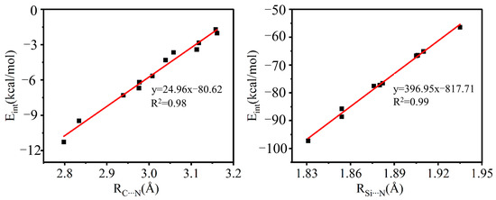 Table 2 lists the topological parameters at the bond critical points (BCPs) of T⋯N and X–T, corresponding to the AIM diagrams in Figure 4. These parameters are closely related to the strength of the TB, and Figure 5 shows the relationship between the Eint and the electron density ρ at the T⋯N BCP, revealing a strong positive correlation between the parameters; i.e., with an increase in electron density, the interaction energy also increases, with a correlation coefficient of 0.98–0.99. For the CF3 complexes, the electron density varies from 0.007 to 0.01 a.u. It can also be seen in Figure 4 that there is no obvious bond path between C and N in C⋯N, but three paths from N to F. For the SiF3 complexes, the situation is different. The electron density is one order of magnitude larger than the –CF3 value and it can be seen from the figure that there is an obvious bond path between Si and N in the Si⋯N interaction. In addition to the numerical changes, we also noticed a change in sign. When the C atom is replaced by the Si atom, the energy density H at the T⋯N BCP also changes from positive to negative, indicating a change in the type of T⋯N bond from noncovalent interactions in the –CF3 systems to partially covalent interactions in the –SiF3 systems, resulting in an enhanced TB.