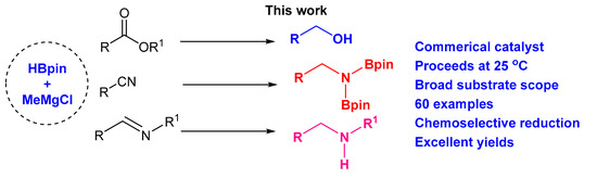Han HJ, Park SY, Jeon SE, Kwak JS, Lee JH, Jaladi AK, Hwang H, An DK. Grignard Reagent-Catalyzed Hydroboration of Esters, Nitriles, and Imines. Molecules. 2023; 28(20):7090. https://doi.org/10.3390/molecules28207090