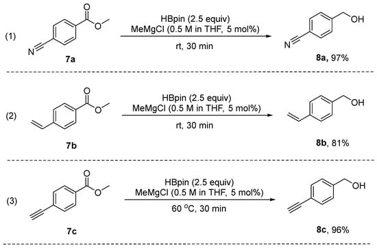- Han, H.J.; Kim, H.T.; Kim, J.H.; Jaladi, A.K.; An, D.K. Magnesium-mediated hydroboration under ambient condition: A reduction of esters, aldehydes, and ketones. Tetrahedron 2023, 142, 133500–133505. [Google Scholar] [CrossRef]