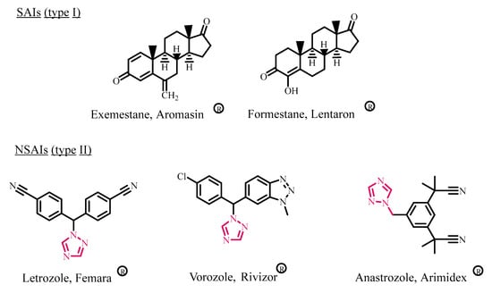 - Avvaru, S.P.; Noolvi, M.N.; Aminbhavi, T.M.; Chkraborty, S.; Dash, A.; Shukla, S.S. Aromatase inhibitors evolution as potential class of drugs in the treatment of postmenopausal breast cancer women. Mini Rev. Med. Chem. 2018, 18, 609–621. [Google Scholar] [CrossRef]