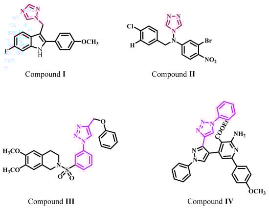 Kang et al. described the synthesis, cytotoxicity, and aromatase inhibitory action of a 2-phenyl indole scaffold replaced with an azole ring at the 3-position [20]. Compound I (Figure 2) with a triazole ring had the most promising anti-aromatase action, with an IC50 value of 0.014 µM compared with the reference letrozole (IC50 = 0.049 µM). The potency was reduced when the triazole ring of compound I was replaced with an imidazole ring. The biological results showed that indole derivatives with a 1,2,4 triazole ring inhibit aromatase more effectively than imidazole-containing derivatives, which could be related to the particular orientation and polarity of triazole in the aromatase binding pocket.