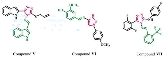 Additionally, Kumar et al. [28] have revealed the antiproliferative efficacy of some novel fluorinated Schiff bases generated from 1,2,4-triazoles. Compound VII (Figure 3) displayed good antiproliferative activity, with 73%, 77%, and 69% growth inhibitory activity at 10 µM against Colo-205, MDA-MB 231, and IMR-32 cell lines, respectively.