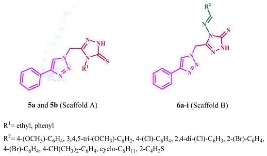 On the other hand, the novel synthesized compounds 6a–i were produced in 77–85% yields through the reaction of an equivalent amount of 4-amino-5-((4-phenyl-1H-1,2,3-triazol-1-yl)methyl)-2,4-dihydro-3H-1,2,4-triazole-3-thione 4 with the appropriate aryl aldehyde, cyclohexane carbaldehyde, or thiophene-2-carbaldehyde in the presence of a catalytic amount of glacial acetic acid in absolute ethanol. The structures of new hybrids 6a–i were confirmed by spectroscopy (1H NMR, 13C NMR, EI-Mass) and elemental analyses. For example, the 1H NMR spectrum of compound 6b in DMSO-d6 (400 MHz, δ ppm) showed a singlet signal (3H) at δ: 3.64 ppm assigned to the OCH3 group with the appearance of another singlet signal (6H) at δ: 3.77 ppm, which attributed to another two equivalent OCH3 groups. Additionally, the spectrum showed a singlet signal (2H) at δ: 5.45 ppm assigned for methylene linker, and the multiplet signal (8H) at δ: 6.87–7.27 ppm corresponded to aromatic rings and CH=N protons. Also, the spectrum displayed a characteristic singlet signal (1H) at δ: 8.17 ppm corresponding to triazole H. Finally, the appearance of a singlet (1H) at δ: 10.39 ppm, which was exchangeable with D2O, was assigned to NH. All demonstrate the formation of novel 1,2,3-triazole/1,2,4-triazole 6a–i derivatives.