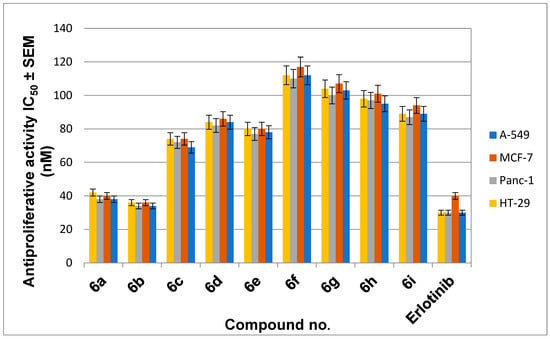 The newly synthesized compounds 5a, 5b, and 6a–i were tested for antiproliferative activity against four different types of cancer cells: A-549 (epithelial cancer cell line), MCF-7 (breast cancer cell line), Panc-1 (pancreas cancer cell line), and HT-29 (colon cancer cell line) using Erlotinib as the reference drug [34,35]. The results of calculating the IC50 of each compound are shown in Table 1, Figure 5.