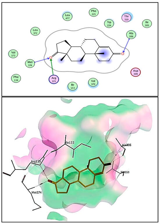 The crystal structure of aromatase cytochrome P450 in a complex with androstenedione drug was obtained from the protein data bank and used for docking studies. Binding modes and interactions of the co-crystallized androstenedione drug with aromatase cytochrome P450 were used to evaluate the proposed compounds’ binding because of binding similarities with the proposed compounds [44]. Androstenedione is a selective aromatase inhibitor with a binding score (−8.32 kcal/mole) that interacted mainly by hydrogen bond interaction of the carbonyl group with Ala306 (3.45 Å), Arg115 (3.44 Å), and Met374 (2.84 Å) as depicted in Figure 7.