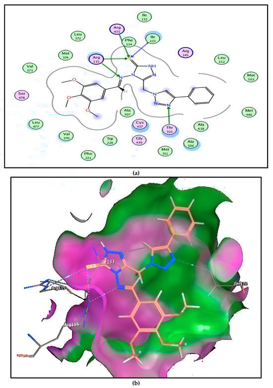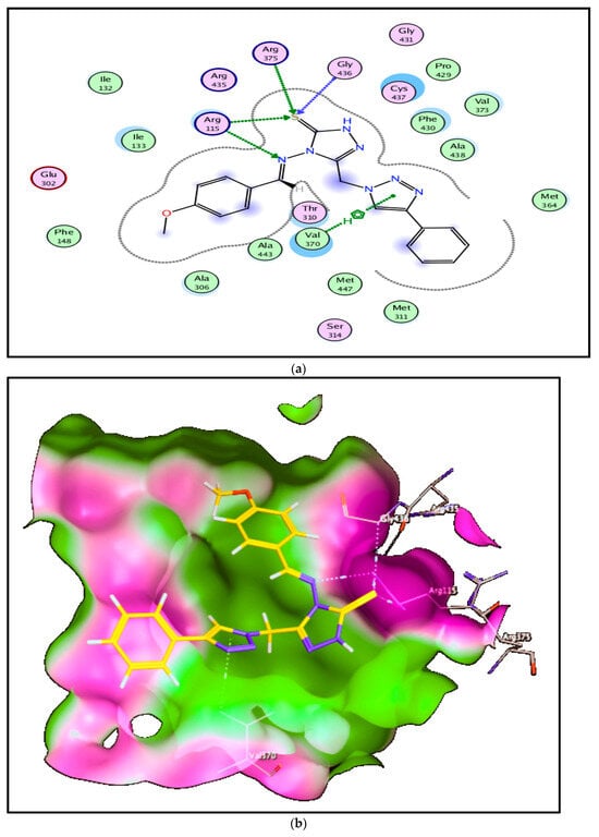 Compound 6a with a high score (−9.64 kcal/mol) showed hydrogen bonding interactions by acting as hydrogen bond acceptor through heteroatoms S and N of this hybrid with hydroxyl moiety of amino acids Gly436, Arg375, and Arg115 (3.93, 4.49, and 3.79 Å, respectively), in addition to strong hydrophobic interaction between the triazole ring and Val370 amino acid (3.74 Å) (Figure 8).