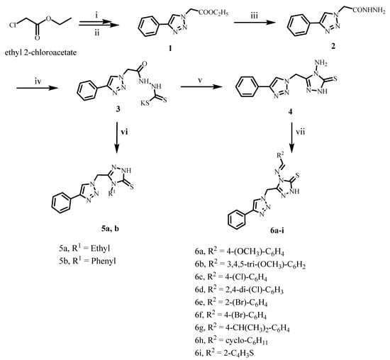 The synthesis of target compounds 5a, 5b, and 6a–i is depicted in Scheme 1. Compound 1 was synthesized using the click reaction. First, ethyl 2-azidoacetate was synthesized by reacting ethyl 2-chloroacetate with two equivalents of sodium azide in acetone and heating at reflux for 24 h. The liquid product obtained following ethyl acetate extraction was subjected to the second reaction step with a combination of phenylacetylene, CuSO4·5H2O, and sodium ascorbate in THF: H2O (1:1 v/v). After 24 h of stirring at room temperature, ethyl 2-(4-phenyl-1H-1,2,3-triazol-1-yl)acetate 7 was obtained in 96% yield [29]. Acetohydrazide derivative 2 was produced in 90% yield by reacting compound 1 with an excess of 99% hydrazine hydrate in absolute ethanol [29].