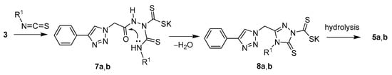 Scheme 2 depicts a proposed mechanism for the formation of compounds 5a and 5b. The reaction begins with the nucleophilic addition of 3 on the appropriate isothiocyanate to generate 7a,b. In the subsequent step, these intermediates undergo cyclocondensation, constructing triazoles 8a,b, from which hydrolysis finally affords 5a,b as isolated products.