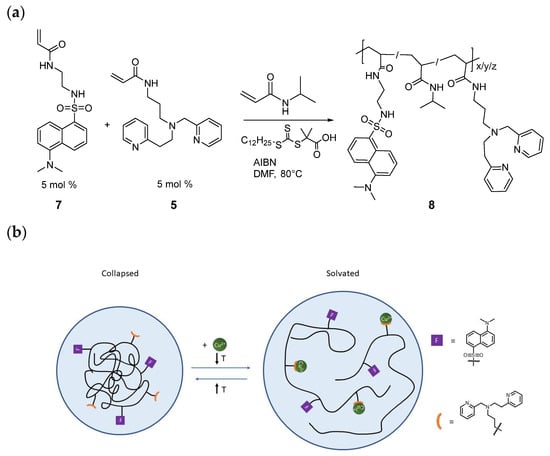 (a) Synthesis of the indicator 8 from PNIPAm, PEPMA-C3-acryamide (7), and dansyl-en-acrylamide (5). (b) Pictorial representation of the sensor design with change in temperature and addition of metal ion: ligand (orange), fluorophore (purple), polymer backbone (black), and metal ion (green).