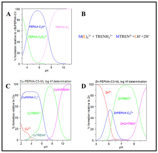 Speciation plots for formation constant determinations of the PEPMA-C3 model ligand 4 with I = 0.1 NaNO3 at 25 °C. (A): pKa determination of the PEPMA-C3-model ligand 4 (here denoted as PEPMA-C3 or i-BuPEPMA-C3) with 2 mol equiv. of HNO3. [ML] = 1.86 mM and I = 0.1 NaNO3 at 25 °C. (B) Equation for formation constant determination; here, 4, denoted as L. TREN, is used as a competing ligand: [M(L)x]2+ + [TRENH3]3+. Ý [M(TREN)]2+ + LH+ + 2H+. (C): Distribution diagram of the PEPMA-C3-model ligand 4 with Cu2+ and TREN species. [Cu2+] = [4] = [TREN•3HCl] = 1.86 mM. (D): Distribution diagram of PEPMA-C3 model ligand 4 with Zn2+ and TREN species. [Zn2+] = [4]= [TREN•3HCl] = 1.86 mM.