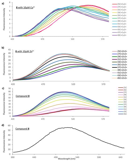 Fluorescence spectra of the indicator 8 (0.1 M MES buffer, pH 6.0) as a function of increasing temperature. λex = 330 nm; excitation slit width = 10; and emission width = 10. (a) Addition of 0.01 mM of Cu2+ to 8, 0.005 g/L; (b) addition of 0.01 mM of Zn2+ to 8, 0.005 g/L; (c) temperature-range fluorescence spectrum of indicator only, 0.005 g/L; (d) full scale fluorescence spectrum of indicator only, 0.005 g/L, 31 °C.