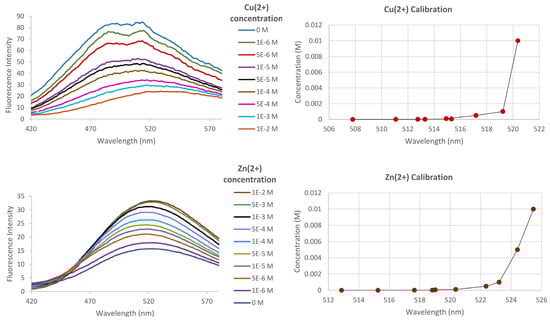 The indicator 8 response to added Cu2+ and Zn2+ was determined via fluorescence titration at 45 °C (Figure 6). The shift of the dansyl fluorescence maxima was used to obtain calibration curves for the metal ions. The approximate limit of detection (LOD) for either metal ion is 500 µM, or approximately 31 µg/mL.
