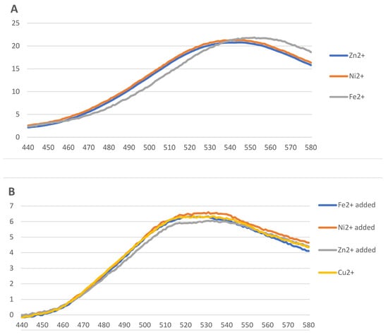 Response of indicator 8 (0.1 M MES buffer, pH 6.0, 0.005 g/L) to other metal ions in presence of Cu2+. (A) response to Zn2+, Ni2+, and Fe2+ alone (10 µM each). (B) response of competing metal ions against Cu2+, showing response to Cu2+ and response from addition of Fe2+, Ni2+, or Zn2+, each 10 µM. λex = 330 nm; excitation slit width = 10; and emission width = 10.