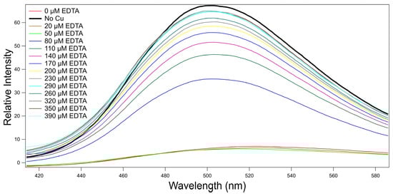 Fluorescence spectra of the polymer sample with 10 μM Cu2+ titrated with different concentration of EDTA. λex = 330 nm; excitation slit width = 10; and emission width = 10. Concentration of the sample: 0.005 g/L in 0.1M MOPS buffer pH 7.0, 35 °C.
