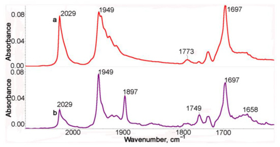 The IR spectra in the ν(CO) range of a cyclohexane solution of 1 before (a, red) and after (b, purple) irradiation.