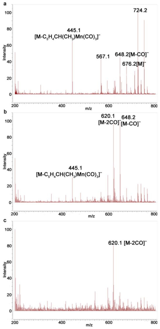 The reverse picture was observed in the case of irradiation of 1 in a solvent mixture of benzene/acetonitrile (Figures S12–S14). The basic ion for compound 1 is the ion [M]−; the ion [M-3CO]− with m/z 592 is also present. It means that, unlike the case with the benzene solution, the loss of six CO ligands from two cymantrenyl fragments was not observed. After irradiation, the ion [M-2CO]− with m/z 620 was detected in the MALDI spectra. Unfortunately, no ions corresponding to dicarbonyl acetonitrile complexes 3 were detected. In all spectra, the ion with m/z 445 was observed, corresponding to the loss of one cymantrenylethyl fragment to give ion [M-C5H4CH(CH3)Mn(CO)3]−.