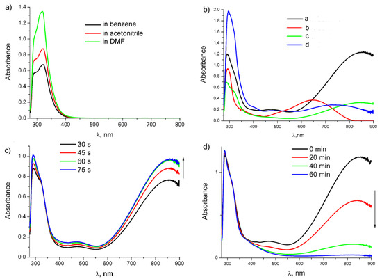 Absorption spectra: (a) compound 1 in different solvents; (b) after irradiation of 1 in different solvents ((a)—in benzene, (c)—in acetonitrile, (d)—in DMF) and after irradiation of 7 ((b), red line) in benzene for 2 min; (c)) UV-vis monitoring of irradiation of 1 in benzene during 75 s; and (d) UV-vis monitoring of the thermal reaction after irradiation of 1 in benzene with 10 equiv. acetonitrile during 60 min.