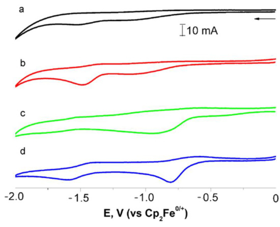 After irradiation of 1, two new waves at 0.17 and 0.91 V are observed on the oxidation branch, indicating that upon irradiation of 1 in DMF (Figure S23), two types of complexes are formed, namely, chelates 2 and dicarbonyl complexes 5, which is in accordance with the results obtained from the UV-vis spectra. The study of the thermal reaction showed that in the absence of CO after 30 min, the peak current of the wave at 0.17 V decreased by about 15%. These data together with an analysis of the UV-vis spectra allow the conclusion to be drawn that oxidation at 0.17 V occurs on the Mn(CO)2 moiety of the chelates 2. On the reduction wave, two distinct quasi-reversible peaks are observed on the reduction branch associated with the reduction of the C=O groups of the imide fragments of dicarbonyl complexes. The first peak appears at a lower voltage than the peak of 1 (Figure 8b). A decrease in the reduction potential value is in line with our previous observations [20] and points to an increase in electron-withdrawing ability of the cymantrenyl fragment ongoing from tricarbonyl to dicarbonyl complexes. The amperage on the waves at −0.81 и −1.59 V decreased insignificantly; therefore, the reduction of both dicarbonyl complexes proceeds simultaneously.