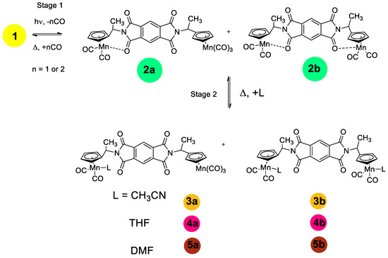 After photolysis, two new bands at 1747 and 1648 cm−1 appear in the spectrum while the bands of the parent 1 remain at 1785 and 1725 cm−1. In the presence of CO, the reverse thermal reaction of the photolysis products with CO occurred to give the parent tricarbonyl complex 1. The reverse reaction is rather slow (half-life time is 181 min and k is 6.38·10−5 s−1). It is seen from Scheme 2 and Scheme S1 that three structures can be expected for chelates, namely (i) one carbonyl group of one imide fragment is involved in chelation (2a), (ii) two carbonyl groups of both imide moieties coordinate to the Mn atom (2b-t) to give trans configuration, and (iii) two carbonyl groups of both imide moieties coordinate to the Mn atom (2b-c) to give cis configuration. An analysis of the IR spectra in the ν(MnC≡O) and ν(NC=O) regions of complex 1 and its photolysis products allowed us to conclude that (i) the CO ligand is removed from both Mn(CO)3 moieties of complex 1 to give chelates, and (ii) one NCO group from each imide fragment coordinates to manganese to give 2b-t, 2b-c, or their mixture. This conclusion follows from the fact that two new imide bands appear in the spectra of the photolysis product at 1747 and 1650 cm−1 associated with symmetric and asymmetric imide modes while the frequencies of non-coordinated (NCO) groups are shifted to 1775 and 1724 cm−1, indicating that the kinematic coupling between symmetric and asymmetric vibrations in the chelate decreased due to coordination of one (NCO) fragment, thus increasing the difference between symmetric and asymmetric modes. In the course of the reverse dark reaction, the spectral pattern was gradually restored: the intensities of the chelate bands decreased while the intensities of the bands of 1 increased.