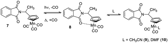 A cymantrenyl (cyclopentadienylmanganesetricarbonyl) fragment is a convenient and available redox group. Earlier, we found that cymantrenylalkylphthalimides have both an oxidation and a reduction potential, which can be varied by changing the solvent nature and substituents in the side chain of the Cp ring and in the phthalimide moiety [20,21]. Photolysis of cymantrenyl derivatives containing n- and π-donor groups in a substituent occurs via CO elimination followed by the formation of chelates with a new hemilabile Mn-donor bond, which allows creation of photochromic systems.