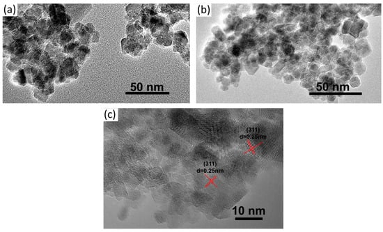 TEM images of (a) Fe3O4, (b) KGM-Fe3O4 NPs and (c) HRTEM image of KGM-Fe3O4 NPs.