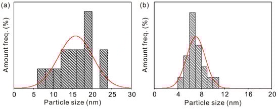 The morphology of Fe3O4 and KGM-Fe3O4 NPs are shown in Figure 1. As shown in Figure 1a, it can be seen that the Fe3O4 nanoparticles were sphere-like, with slight aggregation. From Figure 1b, it appears that the morphology of KGM-Fe3O4 NPs was still quasi-spherical, with improved dispersion compared to that of Fe3O4. In this research, from the HRTEM image (Figure 1c), a number of (311) planes of the Fe3O4 nanoparticles with a lattice fringe spacing of 0.25 nm were detected. The TEM particle sizes of Fe3O4 and KGM-Fe3O4 NPs were statistically calculated using Nano Measurer software (1.2.0.5), and the results are shown in Figure 2a,b. The average particle size of Fe3O4 was approximately 16.0 nm, with a particle size distribution in the range of 8–23 nm. While the KGM-Fe3O4 NPs had smaller particle size (ca. 7.0 nm) and narrower particle size distribution (5.0–11 nm). This is due to the konjac glucomannan chains preventing the nanoparticles from agglomerating in the preparation.