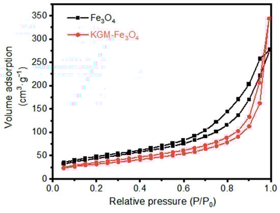 Furthermore, the surface areas of the as-prepared Fe3O4 and KGM-Fe3O4 NPs were calculated using N2 adsorption–desorption isotherms (Figure 3). As obtained from the N2 adsorption–desorption isotherms, the surface areas of the as-prepared the Fe3O4 and KGM-Fe3O4 NPs were 140.4 and 160.10 m2·g−1, respectively. Compared to the Fe3O4 nanoparticles, the steric hindrance of KGM macromolecular chains can hinder the agglomeration of Fe3O4 particles and improve the dispersion of Fe3O4 nanoparticles, thereby increasing their specific surface area.