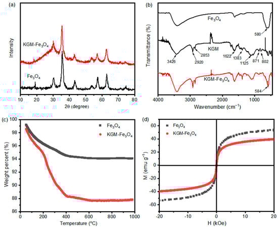 Figure 4a displays the XRD patterns of pure Fe3O4 and KGM-Fe3O4 NPs. In Figure 4a, the XRD patterns of pure Fe3O4 and KGM-Fe3O4 NPs are almost identical, The characteristic peaks of pure magnetite reflections (JCPDS card no. 75-1610) at 30.1°, 35.4°, 43.1°, 53.4°, 57.0° and 62.6° appeared for both magnetic nanoparticles, corresponding to the crystal planes of (220), (311), (400), (422), (511) and (440), respectively, with high intensity diffraction peaks and no other spurious peaks. It shows that the KGM-based magnetic nanoparticles prepared via one-step reaction precipitation have a cubic phase, and their crystalline phase composition was not changed by the addition of KGM.