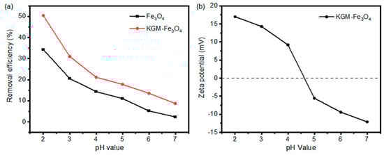 The effects of pH on the removal performance of Cr(VI) by the as-prepared Fe3O4 and KGM-Fe3O4 NPs is shown in Figure 5a. It can be seen that the removal efficiencies of the both materials on Cr(VI) decreased gradually with an increase in pH. At a pH of 2.0, the removal efficiencies of Fe3O4 and KGM-Fe3O4 NPs on Cr(VI) were 34.28% and 50.42%, respectively, while when the pH was increased to 7.0, the removal efficiencies decreased to 2.23% and 8.70%, respectively. This is mainly related to the zeta potentials of KGM-Fe3O4 NPs under varying pHs in a solution (as shown in Figure 5b). With the increase in pH, the surface charge of KGM-Fe3O4 NPs gradually changed from positive to negative with a zero point charge (pHzpc) value of 4.7. That is to say, at a lower pH value (pH < 4.7), the electrostatic attraction between negatively charged HCrO4- and KGM-Fe3O4 NPs resulted in more adsorption of Cr(VI). In addition, comparing the removal efficiencies of the both materials at any pH value, it was found that the KGM-Fe3O4 NPs had a better adsorption effect than the unmodified Fe3O4 nanoparticles did, indicating that the modification of Fe3O4 with konjac dextran had a facilitating effect on the adsorption of Cr(VI). This was mainly due to the presence of a large number of hydroxyl groups on the surface of konjac dextran, and the hydroxyl groups had a good adsorption capacity for Cr(VI).