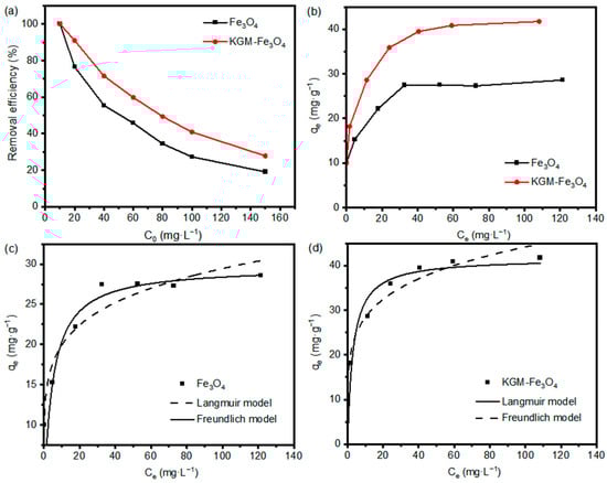 In order to investigate the adsorption performance of KGM-based Fe3O4 nanoparticles on Cr(VI), Cr(VI) solutions with different initial concentrations at pH 4.0 were used to investigate the relationship between the adsorption rate and the initial concentration of Cr(VI), and isotherm adsorption models were fitted based on the measured results. As shown in Figure 6a, the Cr(VI) removal efficiency of the samples decreased gradually as the initial concentration increased. When the initial concentration was at a maximum, the Cr(VI) removal efficiencies of the as-prepared Fe3O4 and KGM-Fe3O4 NPs were 19.1% and 27.8%, respectively. This is mainly because when the Cr(VI) concentration increases, more Cr(VI) ions in the solution compete with each other to bind to the nanoparticles active sites leading to a decrease in the removal rate. Compared to the unmodified Fe3O4, KGM-based Fe3O4 nanoparticles with more active sites resulted in higher removal rates.