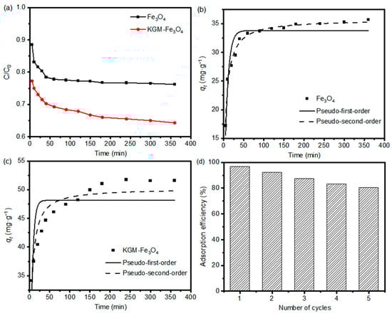 (a) Adsorption rate of Cr(VI) (initial concentration of 150 mg·L−1) onto the as-prepared Fe3O4 and KGM-Fe3O4 NPs, and non-linear kinetic fitting curves of (b) Fe3O4 and (c) KGM-Fe3O4 NPs. (d) Reusability of KGM-Fe3O4 NPs toward Cr(VI) in the adsorption–desorption cycles (dose: 1 g·L−1; initial concentration: Cr(VI) 150 mg·L−1 at pH 4.0; contact time: adsorption 12 h, desorption 12 h). (b) Adsorption capacity.
